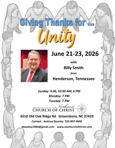 6510 Old Oak Ridge Rd Greensboro, NC 27410 Directions Northwest Church of Christ June 21 – 23, 2026 Giving Thanks for Unity Unity Gospel Meeting