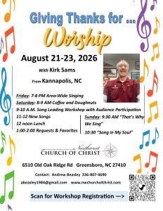 6510 Old Oak Ridge Rd Greensboro, NC 27410 Directions Northwest Church of Christ August 21 – 23, 2026 Giving Thanks for Worship Singing Workshop